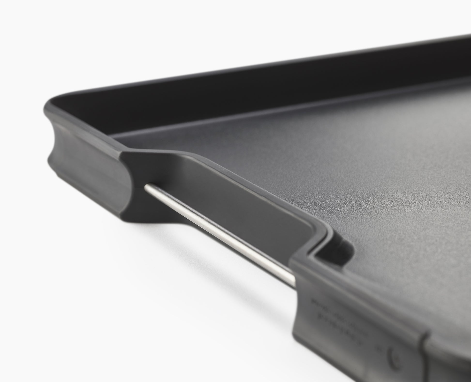 - Unique sloping base and raised edges help catch crumbs and meat juices