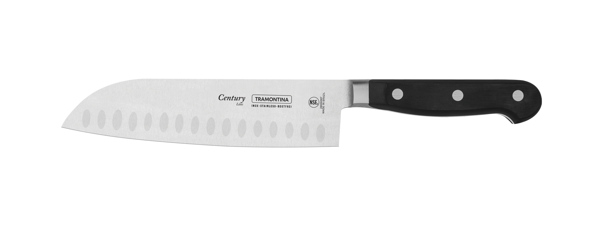 he Tramontina Century 7-inch Santoku knife with stainless-steel blade and fiberglass-reinforced black polycarbonate handle is essential in the kitchens of chefs and cooks, whether professional or amateur. With it, you can cut, slice and chop with guaranteed ease and precision. The blade is forged from special stainless steel that undergoes distinctive heat treatment, consisting of tempering, sub-zero quenching and annealing, ensuring a durable and precise cutting edge, resulting in greater edge strength and precision cutting. Its fiberglass-reinforced polycarbonate handle offers high durability, balance and safety during handling. Its ergonomic design ensures comfort and firmness when cutting, preventing unwanted accidents. The Tramontina Century Santoku knife is easy to clean. It is dishwasher safe, saving time and effort in your daily kitchen routine. With its high performance, practicality and quality in the kitchen, it is indispensable for anyone looking for efficiency and excellence in their culinary tasks! Recommendations for use: Wash and dry the item thoroughly before first use. Sharp object: handle with care and keep out of the reach of children. For longer-lasting products, dry well before storing, including after removal from the dishwasher. Please recycle products and packaging in accordance with existing recycling guidelines. Gross weight: 0.275 kg Package dimensions: 306x44x16 mm Warranty: 25-year warranty against manufacturing defects (90-day warranty as required by law, plus 24 years and 9 months of contractual warranty).